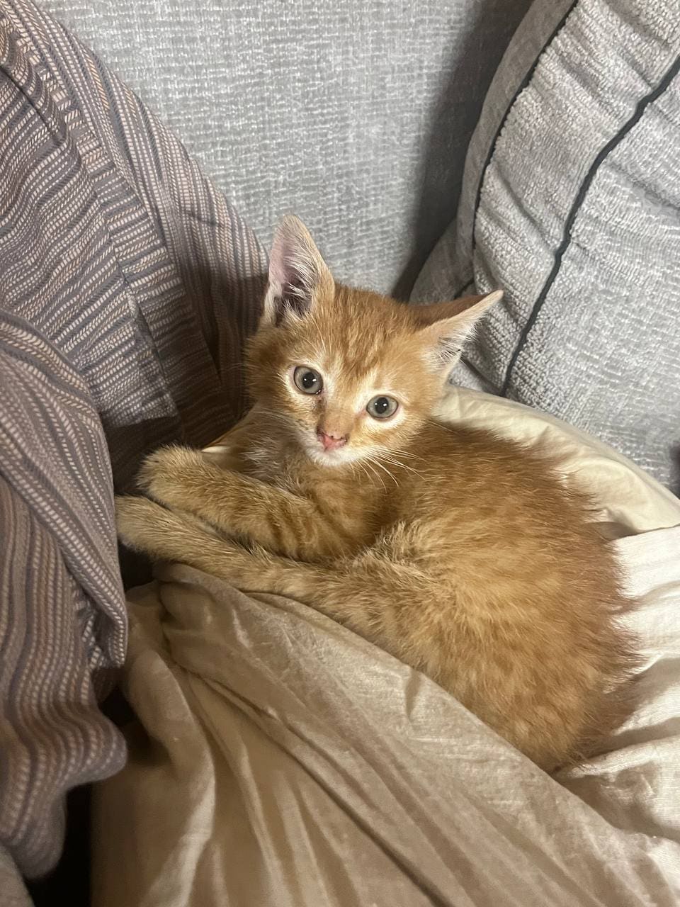 This is Rusoriz the kitten. Tanya and her friend found the kitten in a trash can and decided to take it home and find it a new owner. They named the kitten Rusoriz, which in Ukrainian means ‘to cut Russians’ and is a name of the ongoing fundraising campaign for FPV kamikaze drones for the Ukrainian army.