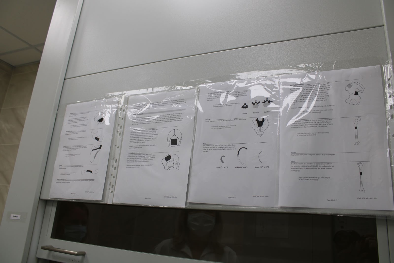 The process begins with a general examination of the bodies, where specialists determine the condition in which the bodies were brought in. They collect biomaterial and label it.