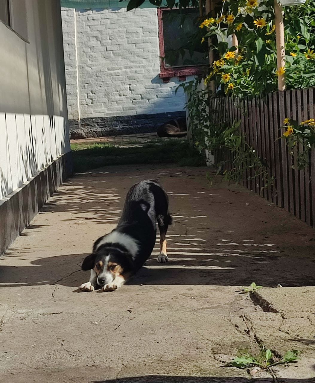 She saw her when she came to visit her family in Vinnytsia region during vacation. The doggie was doing her morning yoga exercise and enjoying the sun.