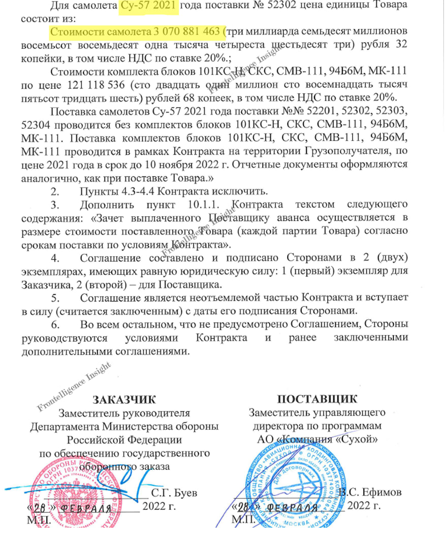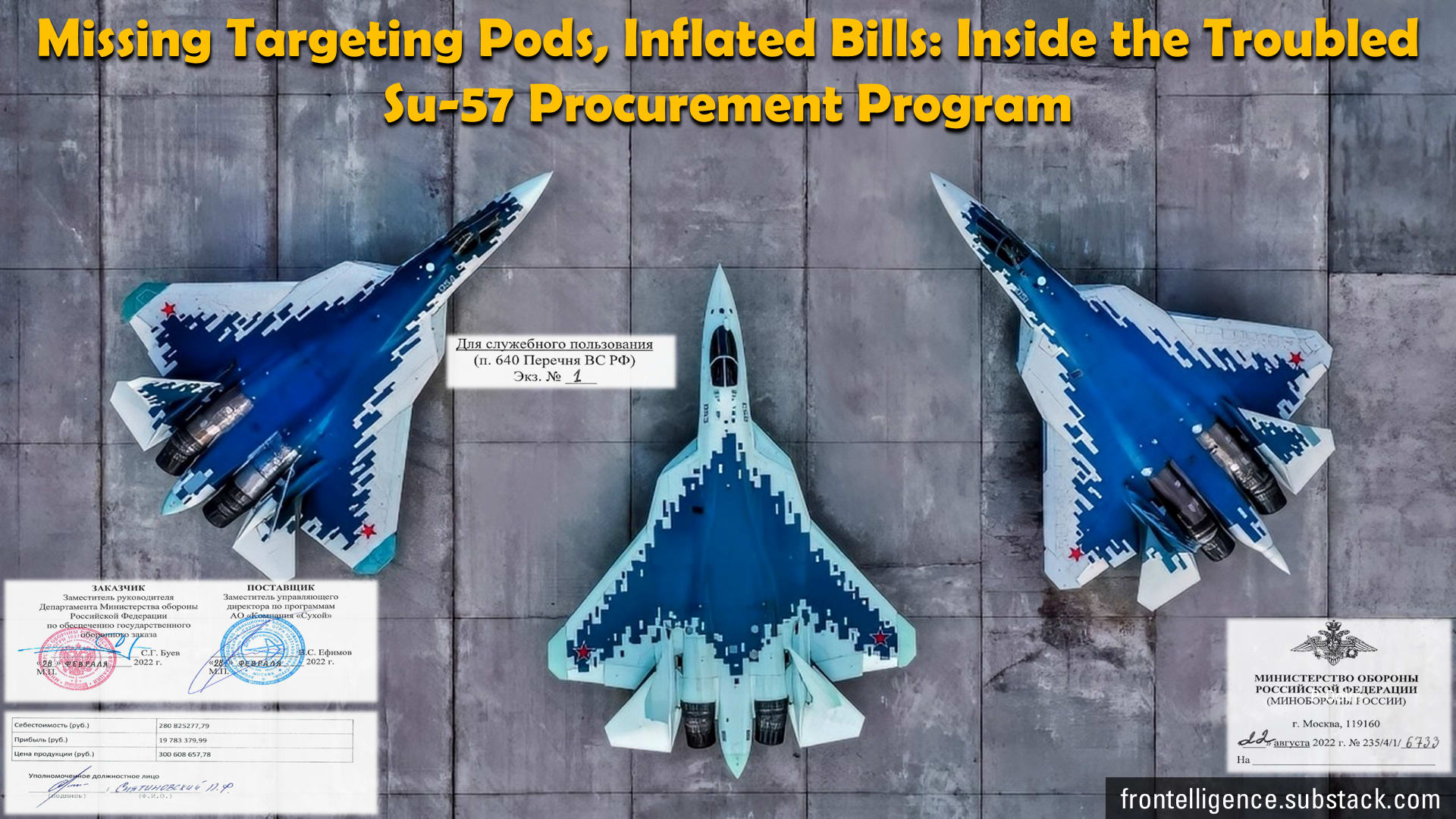 Newly obtained classified documents, accessed by our team, Frontelligence Insight, through a Ukrainian analytics firm “Dallas”, show that Russian Ministry of Defence purchased its fifth-generation Su-57 fighters from Sukhoi for more than 3 billion rubles each. More interestingly, at the outset of the war, these jets were delivered without certain targeting subsystems, leaving them short of advertised operational capabilities.