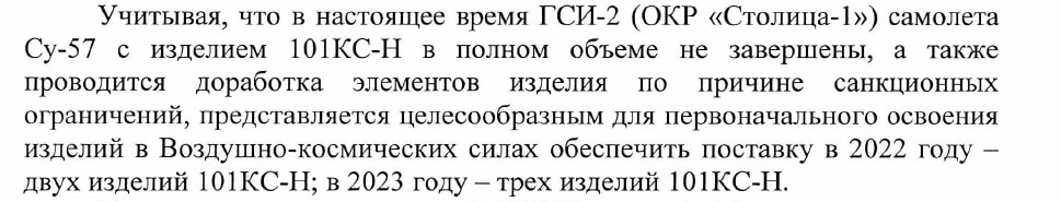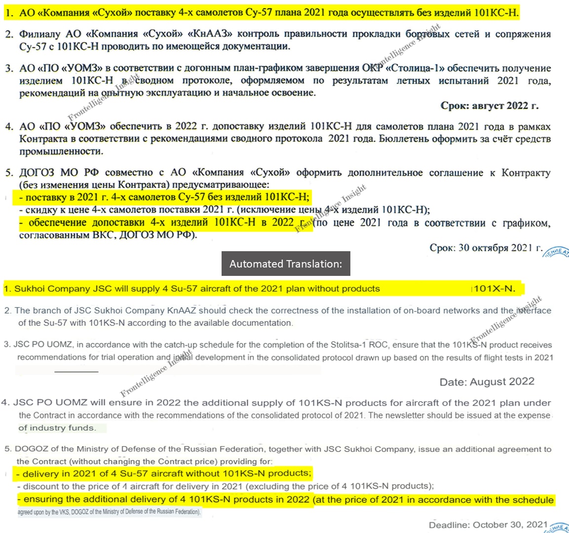 Now we know the problems extend beyond MPPU-50 modules supplied by Mikropribor. The fresh batch of obtained documents show that in 2021, a year before the war, the Russian Defense Ministry formally accepted Su-57 aircraft without the 101KS-N system, an important electro-optical targeting subsystem. This was made possible through Additional Agreement No. 8 and Decision No. 4, which allowed the military to accept the aircraft and retrofit later. In practice, the jets were delivered in stripped-down form - still airworthy, but lacking capabilities advertised by Moscow.