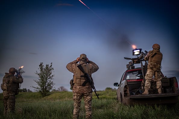 When you look up to the sky, you can see dozens of red dots scattered across the sky, the tracers that let Ukrainian soldiers see where their bullets are firing.