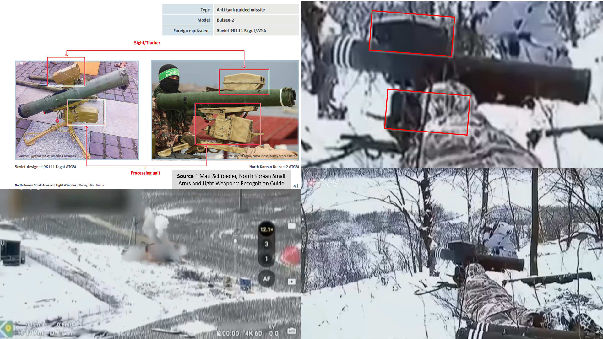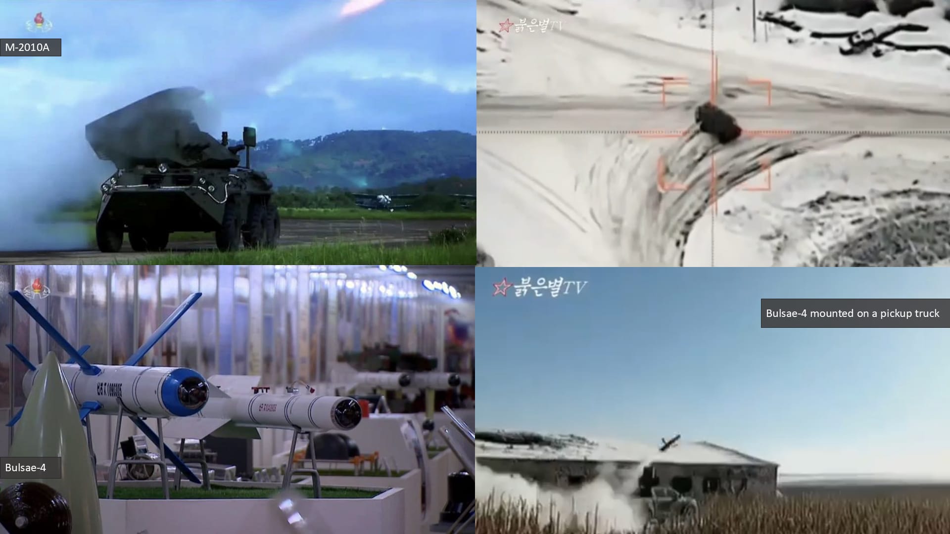 The propaganda video also offered a rare look at North Korea’s newest Bulsae-4 anti-tank missile system, alongside the slightly older Bulsae-2 (or possibly Bulsae-3) variant. Of particular interest was the adaptation of the Bulsae-4 launch platform for use on light SUVs.