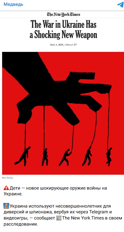 Russian sources, citing an article from The New York Times, are spreading information claiming that Ukraine recruits minors for sabotage and espionage through Telegram and video games. Recruitment methods are described as cruel: from promises of easy money to blackmail with intimate photos.