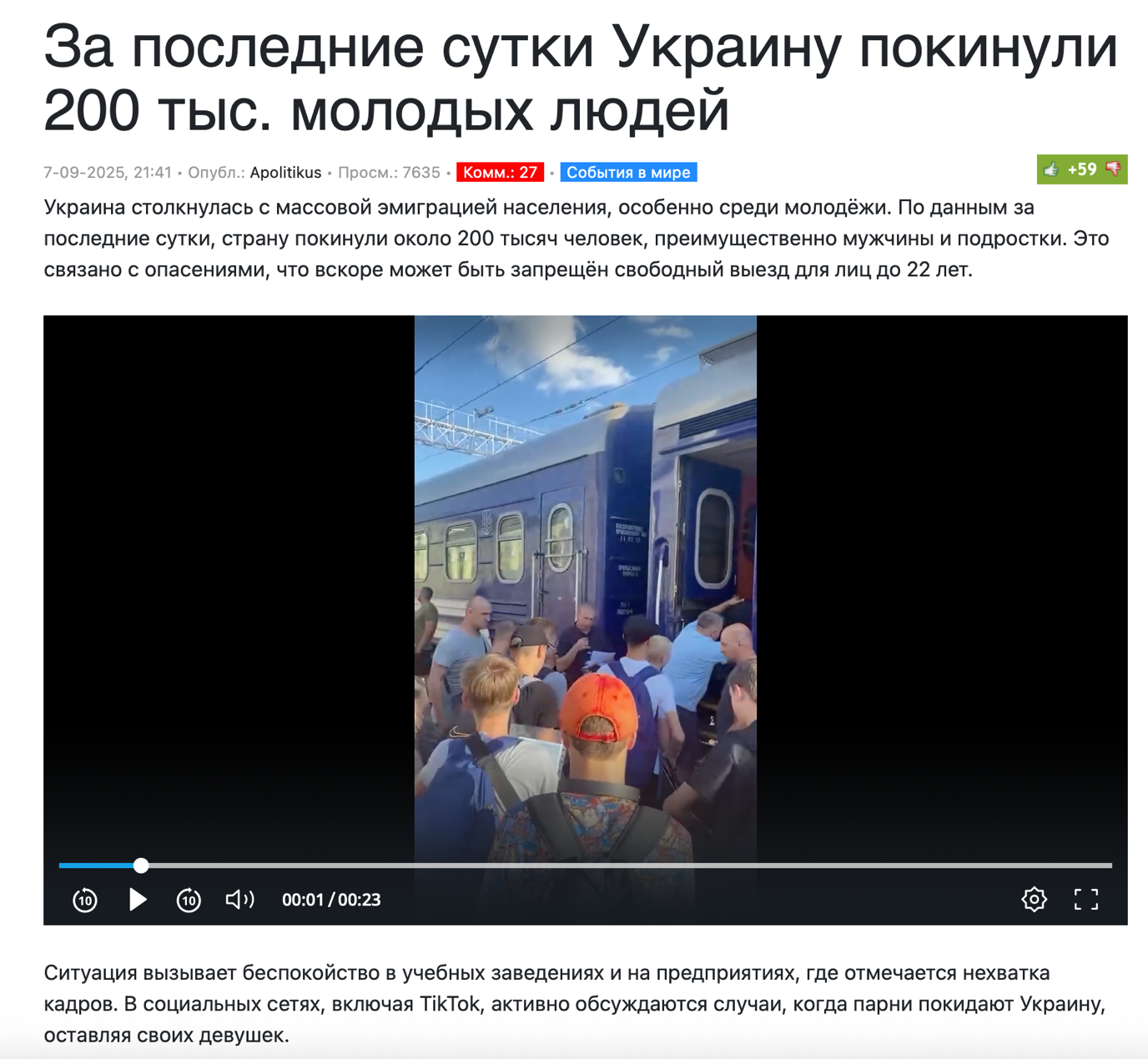 This is false. According to data from the State Border Guard Service, only 52,000 people left Ukraine on September 6. It is unknown how many of them were men aged 18–22, but even the total number is almost four times smaller than stated in the Russian claim. The video shows a children’s basketball club traveling to a training camp in the Vinnytsia region.