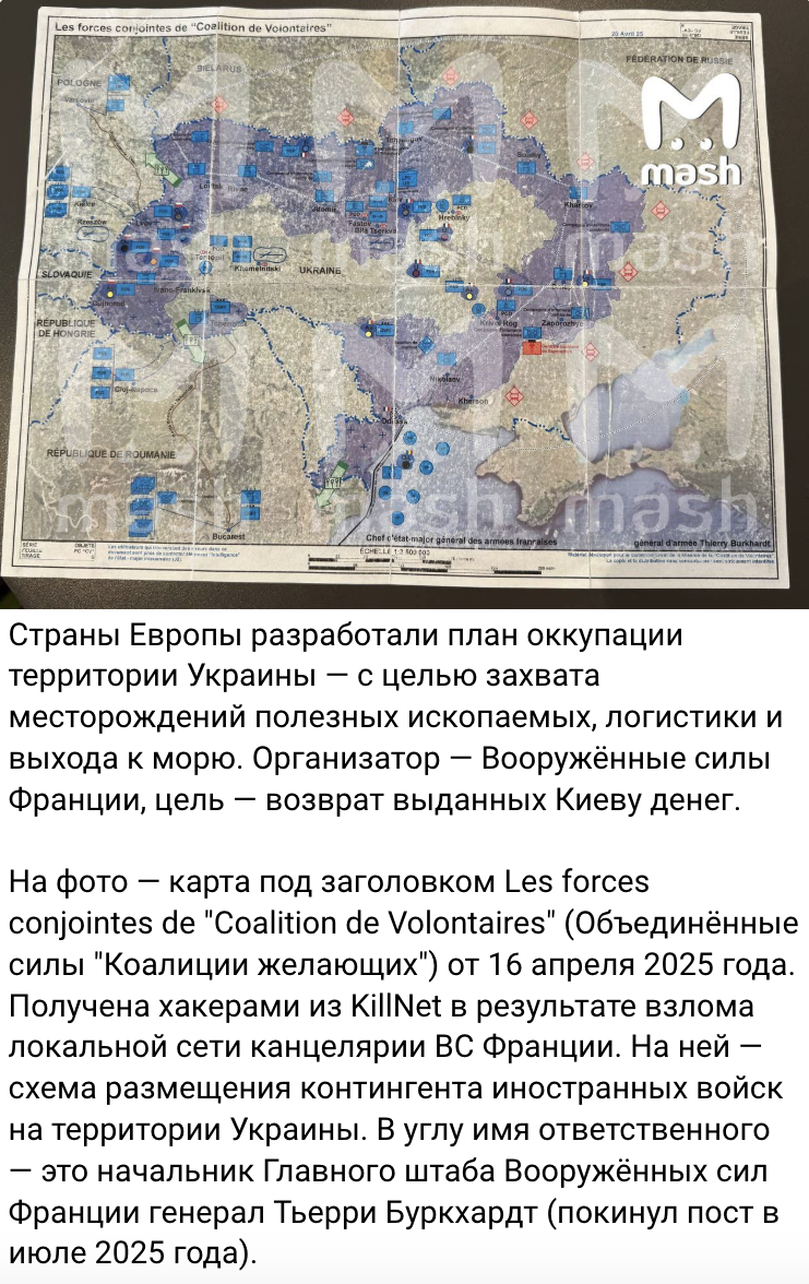 Social media users are sharing a map that allegedly shows how an international “coalition of the willing” has divided Ukrainian territories for future occupation and the seizure of mineral resources. The map indicates where troops from France, the United Kingdom, Poland, Romania, Hungary, and other neighboring states are supposedly going to be stationed. The photo was allegedly obtained by Russian hackers who hacked the network of the French Armed Forces General Staff Office.