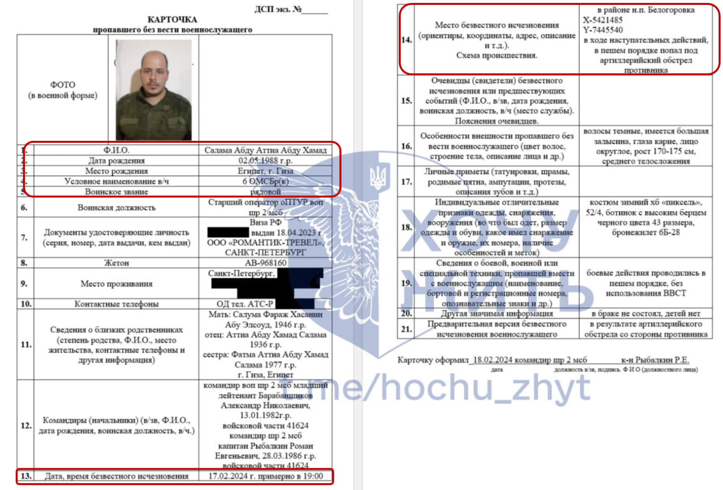 b) Case 2: Egyptian citizen Salama Abdu Attiya Abdu Hamad, born May 2, 1988, also served in the 2nd Separate Motor Rifle Brigade. According to records, he went missing near Belohorivka while on foot during an assault. Combat details indicate he came under artillery fire and disappeared at 19:00 on February 17, 2024.
