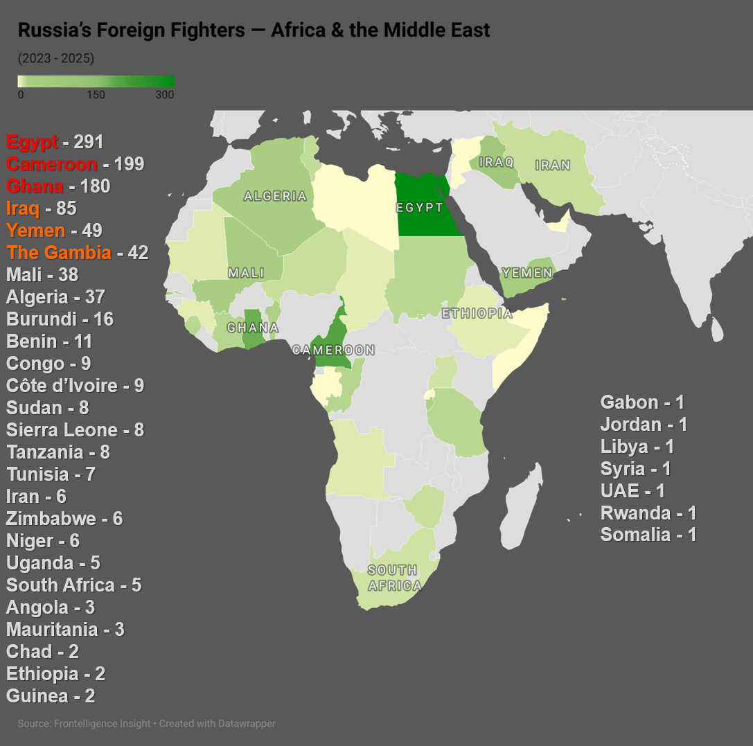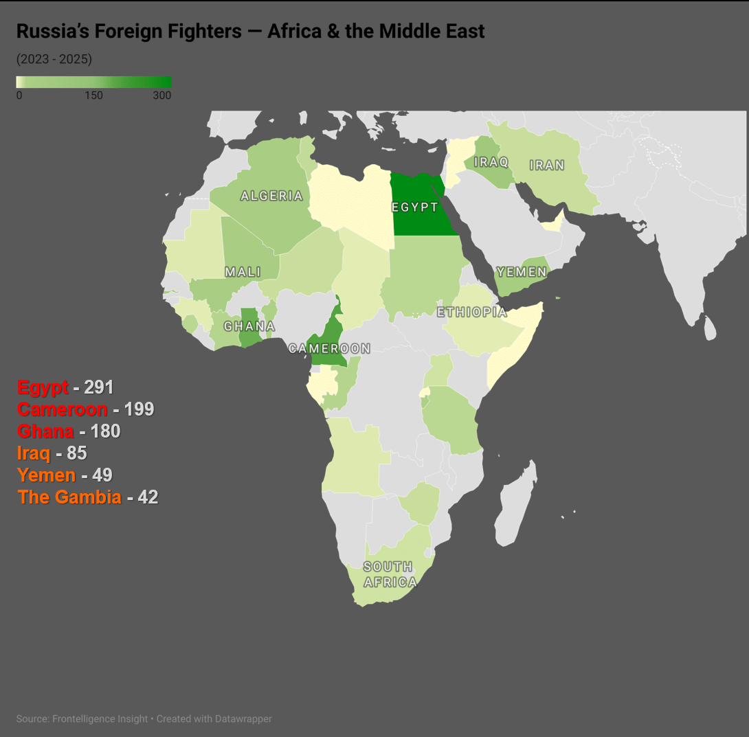 The composition of Russia’s mercenaries in Africa and the Middle East is geographically diverse, but Egypt stands out as the leading contributor. Of more than 1,200 reviewed records - 291, roughly 25%, are identified as Egyptian. Although the roster is still incomplete, the data indicates that Egyptians make up the largest share of volunteers