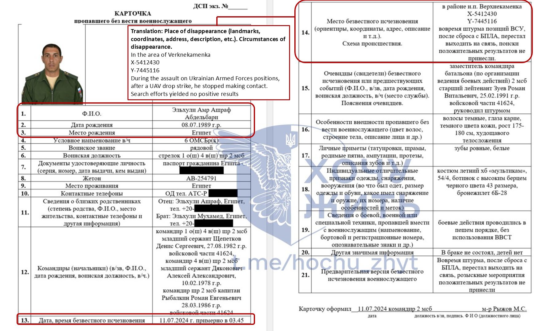 a) Case 1: Russian MIA records list Egyptian citizen Al-Hudi Amr Ashraf Abdelbari, born July 8, 1989. He signed a contract with the Russian army and served in the 2nd Separate Motor Rifle Brigade. According to the record, he went missing near Verkhnokamianka during an assault against Ukrainian forces. Combat details suggest he was on foot during the attack and disappeared following a UAV-dropped munition strike on July 11, 2024, around 03:45.