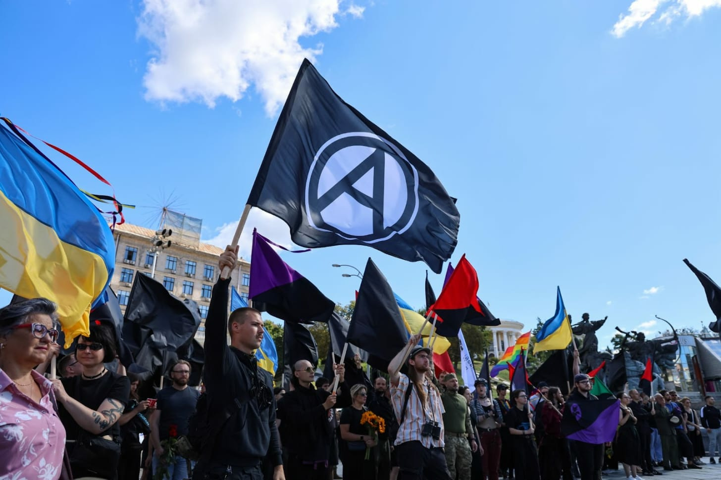 Just a month ago, one of Ukraine’s most well-known anarchists, Davyd Chychkan, died defending the country. Mourners attending his military funeral bid farewell to him against the backdrop of black anarchist flags, blue-and-yellow flags of Ukraine, purple-and-black anarcho-feminist flags, LGBTQ+ flags, and even red-and-black banners of anarcho-communism.