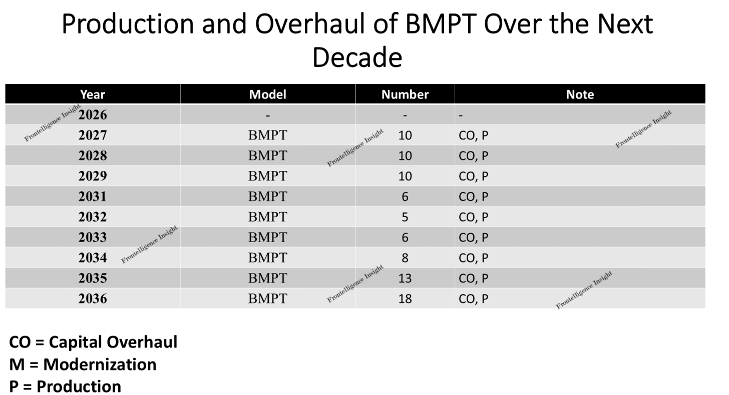 Scarce information about the program has fueled speculation about its future. These newly obtained documents suggest the skepticism was justified: compared with other platforms, BMPT production appears extremely limited, with only 86 vehicles slated for overhaul and production between 2027 and 2036.