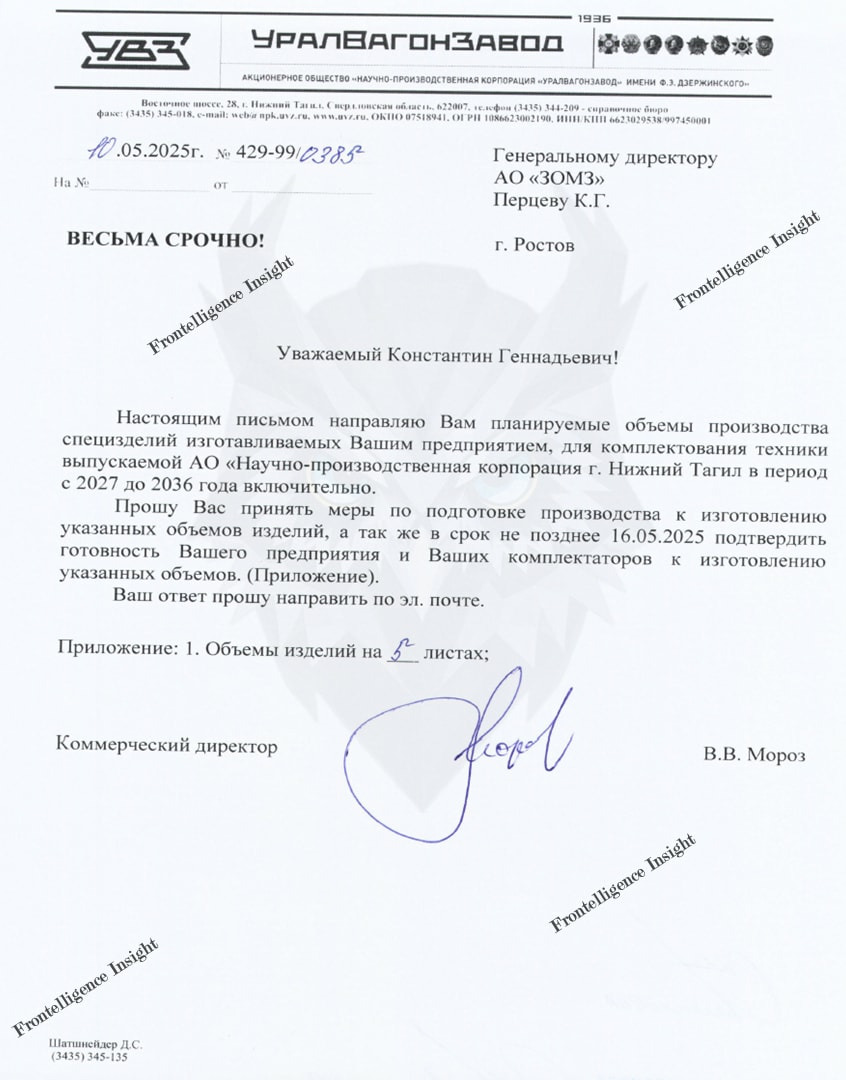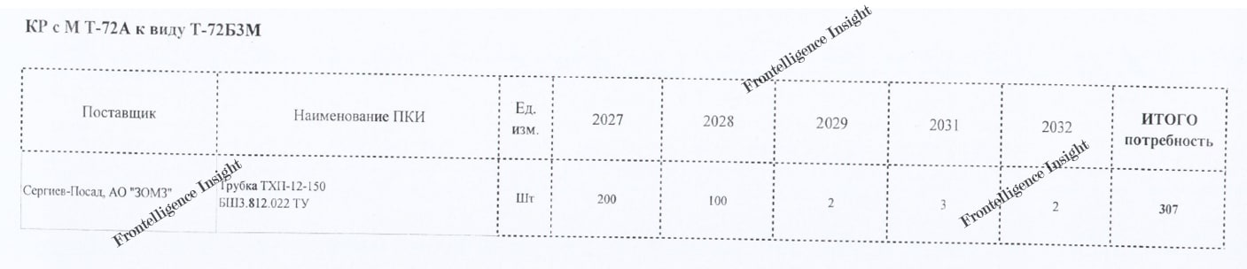 Another document proved decisive. In a request from Uralvagonzavod’s commercial director to ZOMZ, the company outlined long-term procurement plans running from 2027 through 2036. The letter, available in full at the end of this report, contained detailed annual projections not only for new production but also for capital overhauls (CO) and modernization (M). Crucially, the numbers covered both T-72 and T-90 variants, including the new T-90M2.