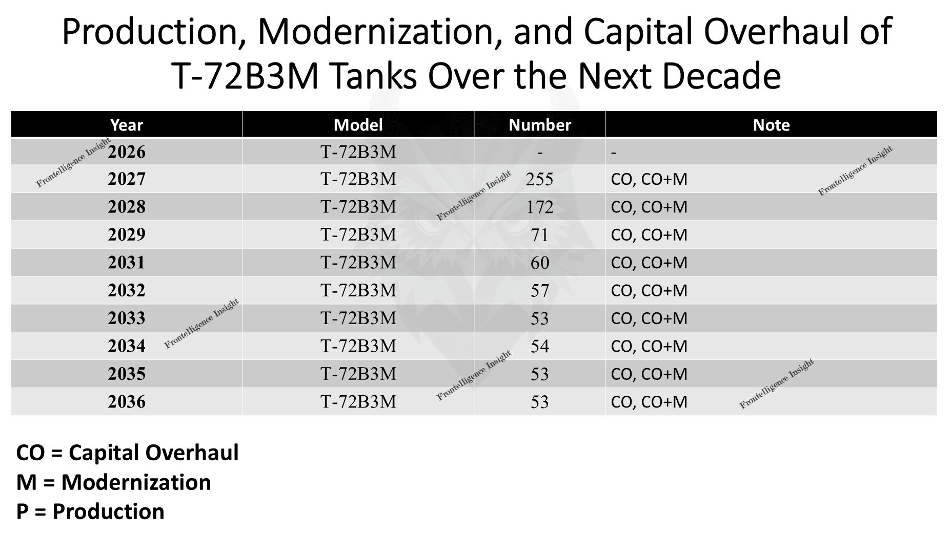 Essentially, the data indicate that Russia plans to overhaul and modernize a total of 828 vehicles into the T-72B3M configuration by 2036. As with the T-90M and T-90M2, peak activity is scheduled around 2028, with 498 T-72B3M units expected to be produced or upgraded between 2027 and 2029. If we combine these figures with projected T-90 variants, the total rises to 2,611 tanks as a baseline for the 2026–2036 period - enough to fully modernize and update Russia’s tank fleet. However, because we are less confident in the methodology for calculating the T-72 figures, we have chosen not to include this number in our final summary.