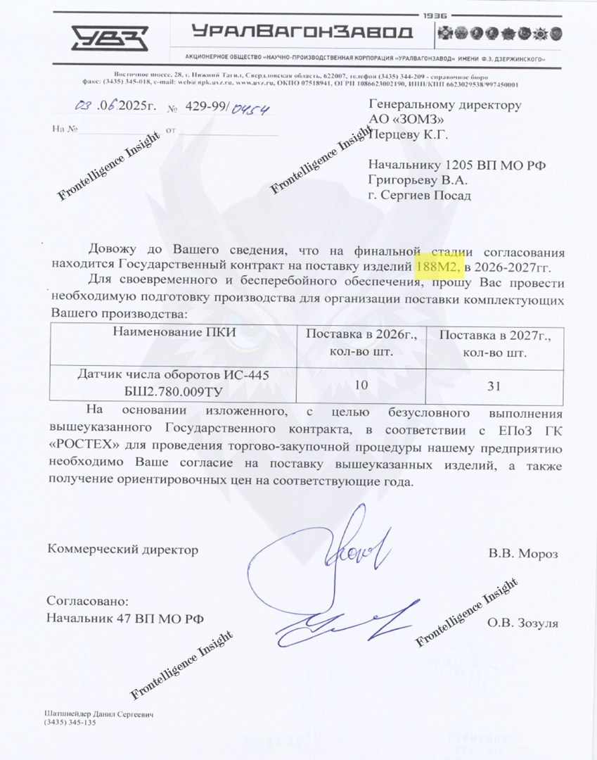 Our investigation began with what appeared to be a routine document in our hands: a letter from Uralvagonzavod, Russia’s largest tank manufacturer, to the Zagorsk Optical-Mechanical Plant (ZOMZ) and a Defense Ministry representative. The company requested parts designated IS-445 for a project identified only as “Product 188M2.” At first, the document seemed unremarkable. But a closer look revealed it as a doorway to a much larger story.