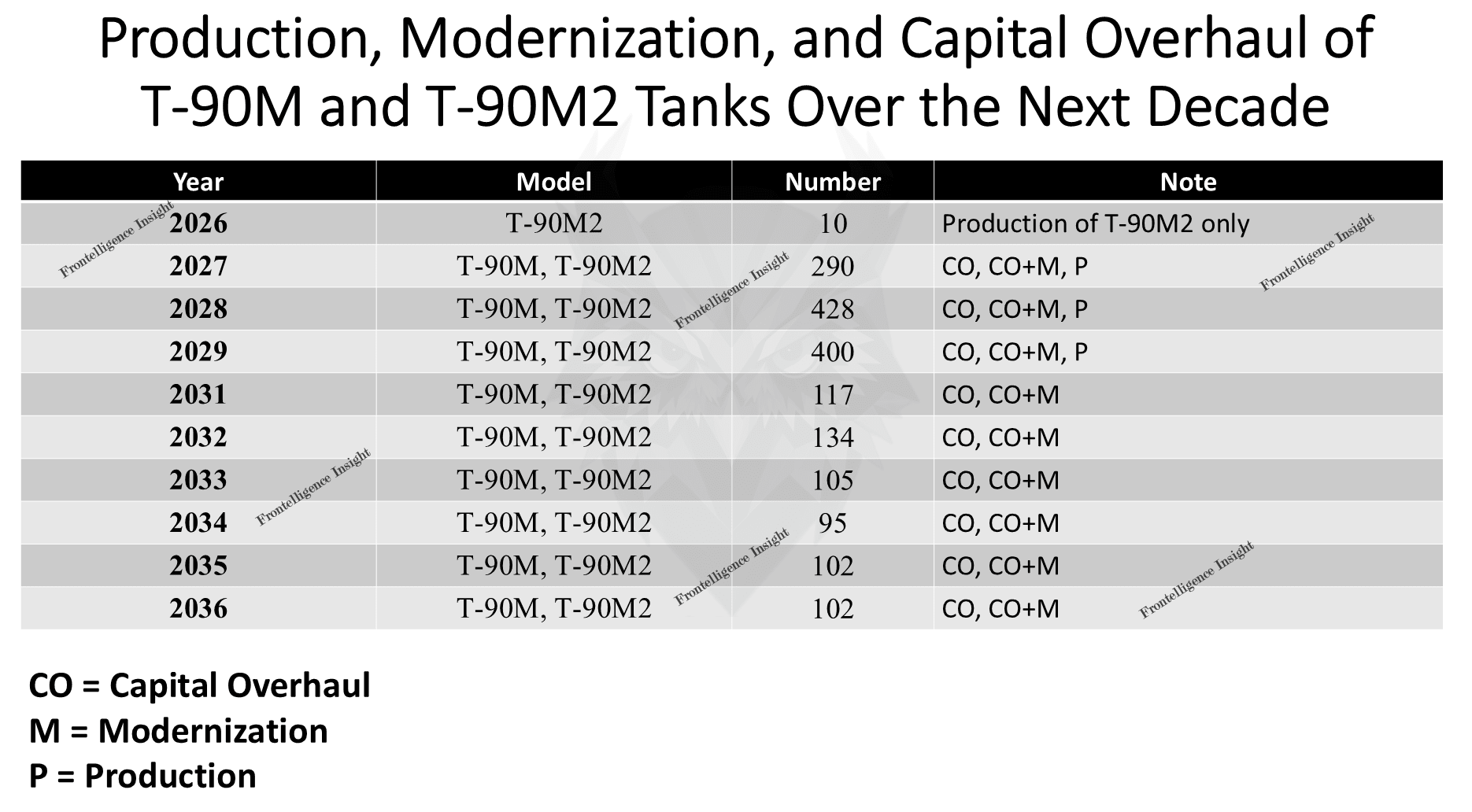 After that, orders appear to cover only parts for overhauls and upgrades, with no new production listed. The reason for this gap is unclear. Our team has speculated that 2030 may be reserved for factory reorganization, expansion, or modernization, which could explain the missing year. Once such changes are complete, production could resume under an updated schedule. We see little reason to assume that Russia will halt new tank production, thus it is more likely that the plan after 2029 represents a minimal projection rather than a full production schedule. For now, however, these interpretations remain speculative.