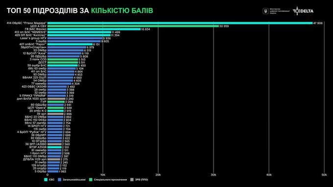 Ranking of points among Ukraine’s top drone units for September 2025, showing a significant disparity between leading units and the rest.