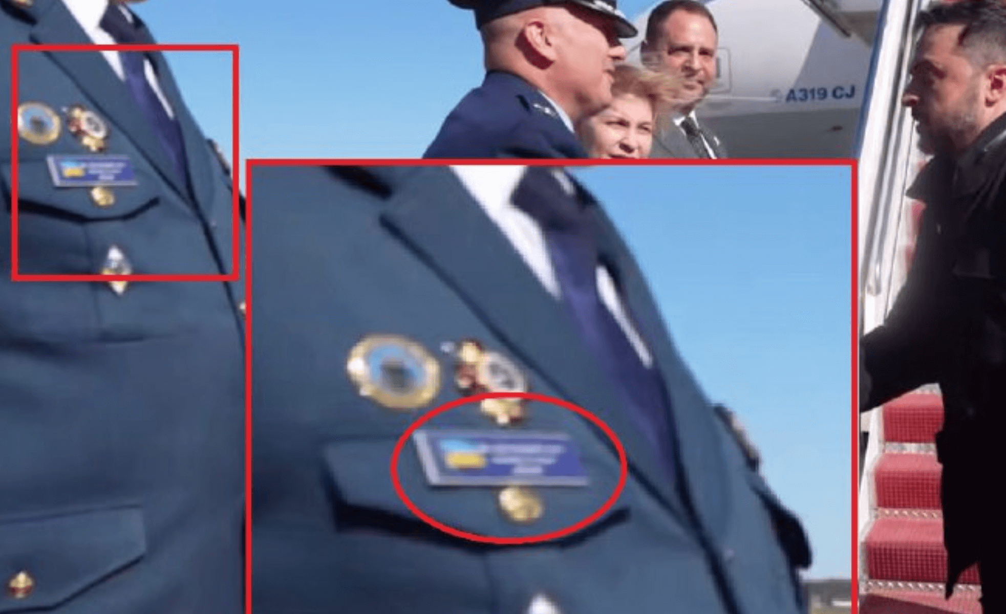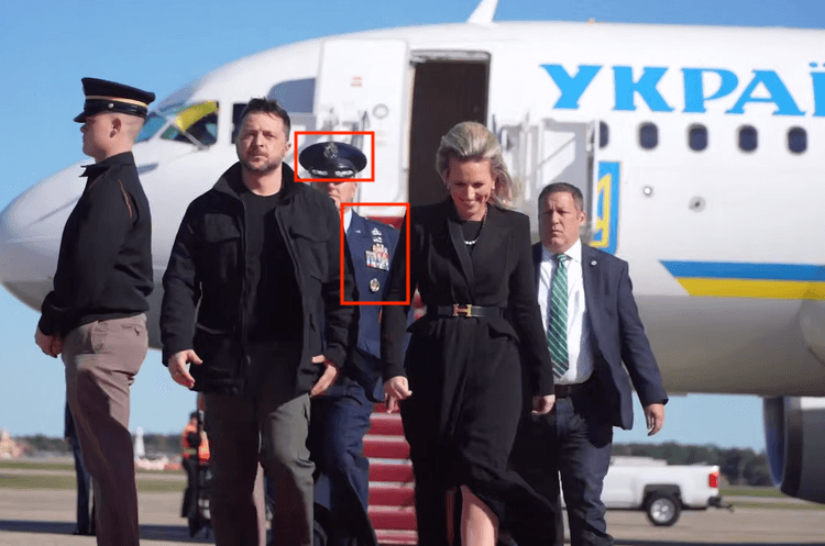 This is clearly visible in the next frame, where the officer is walking behind Volodymyr Zelenskyi. His attire has all the distinctive features of the U.S. Air Force uniform: blue-colored fabric, significantly darker than the uniform of the Ukrainian Air Force, a different cut of the service coat, and the appearance of the cap. American insignia can also be seen on the uniform. This is exactly the type of dress uniform worn by U.S. Air Force officers during official and ceremonial events, including welcoming high-ranking officials at military bases.