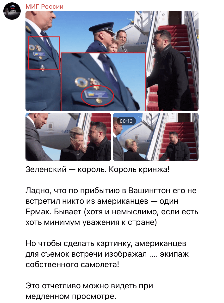 Information is being spread online claiming that American representatives did not meet the President of Ukraine, Volodymyr Zelenskyi, upon his arrival in the USA. Instead, he was greeted at the aircraft stairs by the crew of the Ukrainian plane and Andrii Yermak, the Head of the Office of the President. As evidence, a video is provided where a Ukrainian flag is visible on the chest patch of the serviceman who meets Zelenskyi.