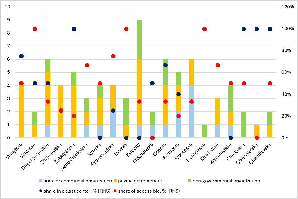 Chart 1. Distribution of psychological assistance centers by form of ownership (FOP, state, municipal, or other organization), location (regional center or other locality), and accessibility (inclusivity)