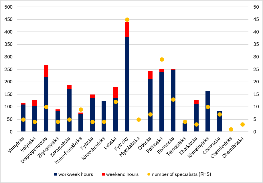 Chart 2. Resources of psychological assistance centers—total working hours and number of specialists