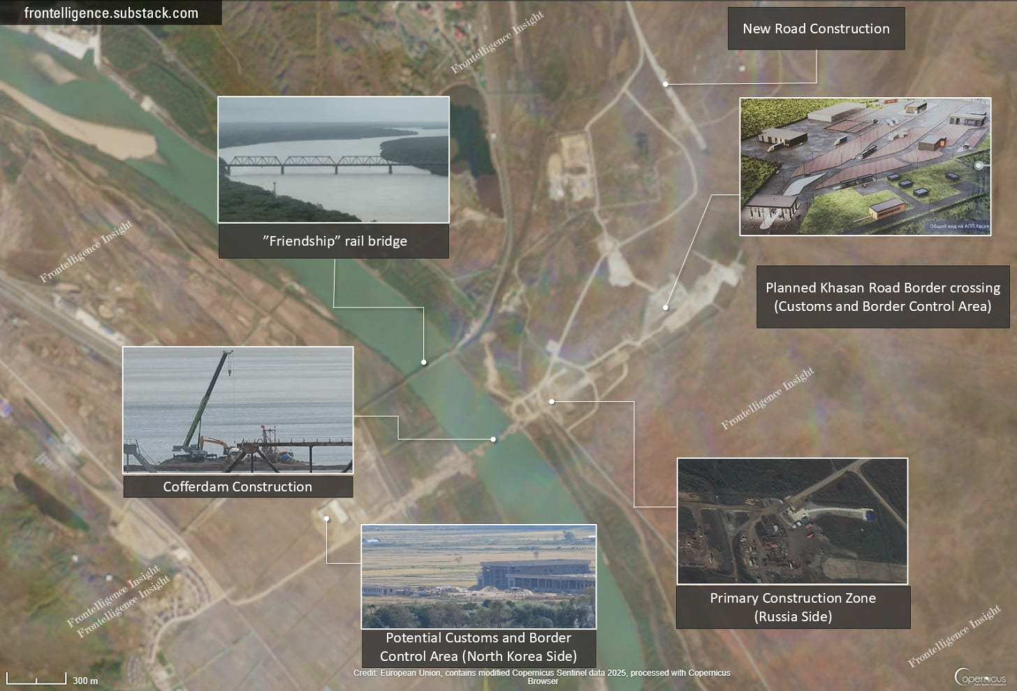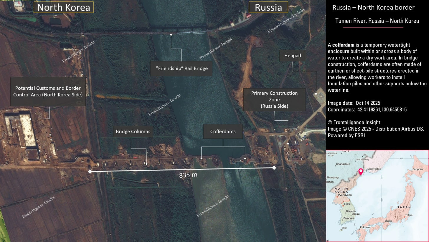 Construction began in early 2025 with preparatory work, including the development of logistics routes and access roads to the site. By October 14, 2025, satellite imagery shows steady progress on the new road bridge over the Tumen River. On the North Korean side, crews have advanced well into the middle of the river, constructing earthen cofferdams to install support piles. On the Russian side, at least two cofferdams are also visible, though progress there appears to be somewhat slower.