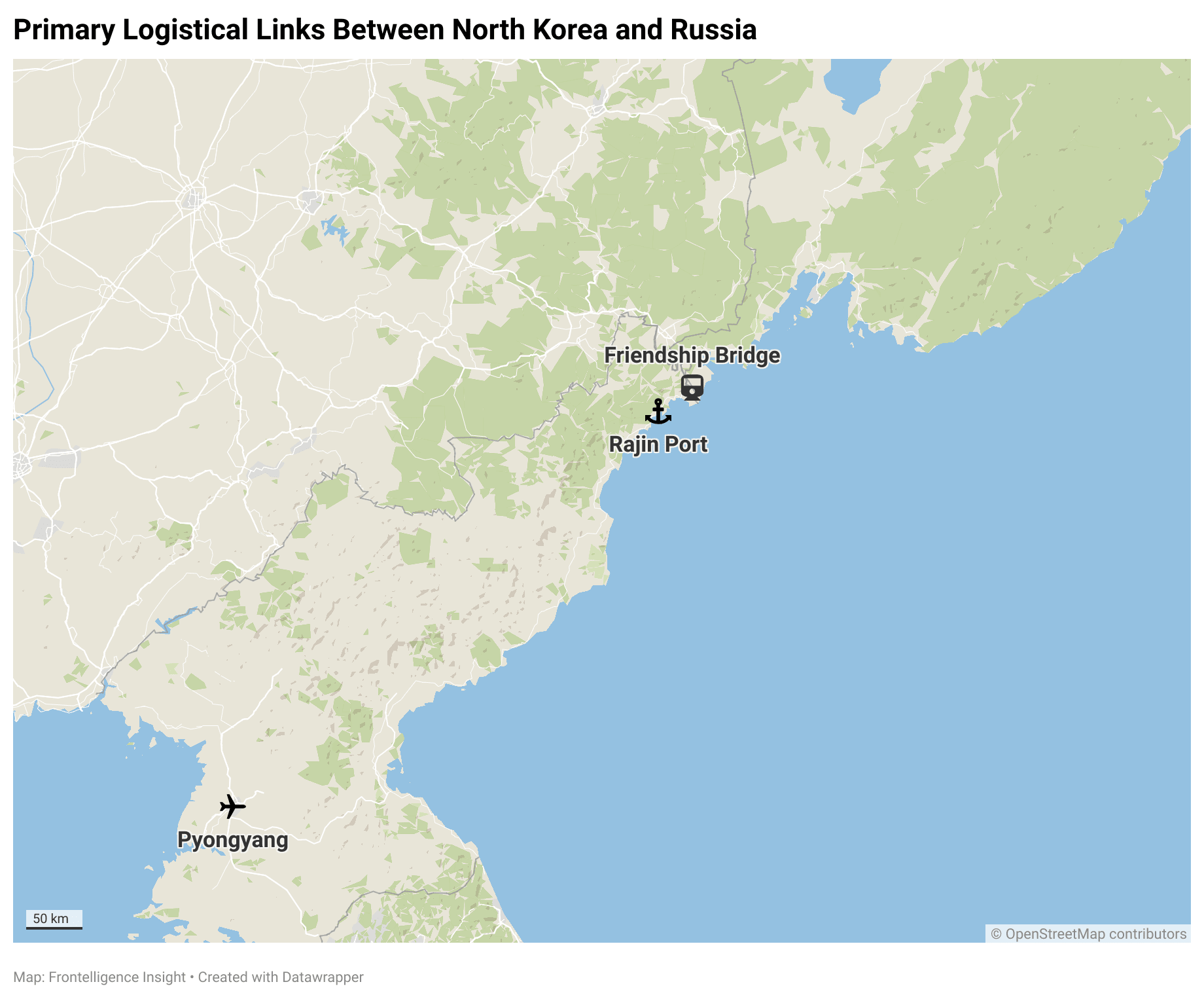 At present, Russia has no direct road connections with North Korea. The only existing land link is the Korea–Russia Friendship Railroad Bridge, opened in the late 1950s, which remains the sole fixed crossing between the two countries. Beyond that, bilateral transport relies on limited air connections, via Pyongyang International Airport, and maritime routes such as the North Korean port of Rajin. The port has gained renewed importance in recent years, serving as a logistics hub for shipments of artillery, mortars, and other ammunition supplied to Russia.