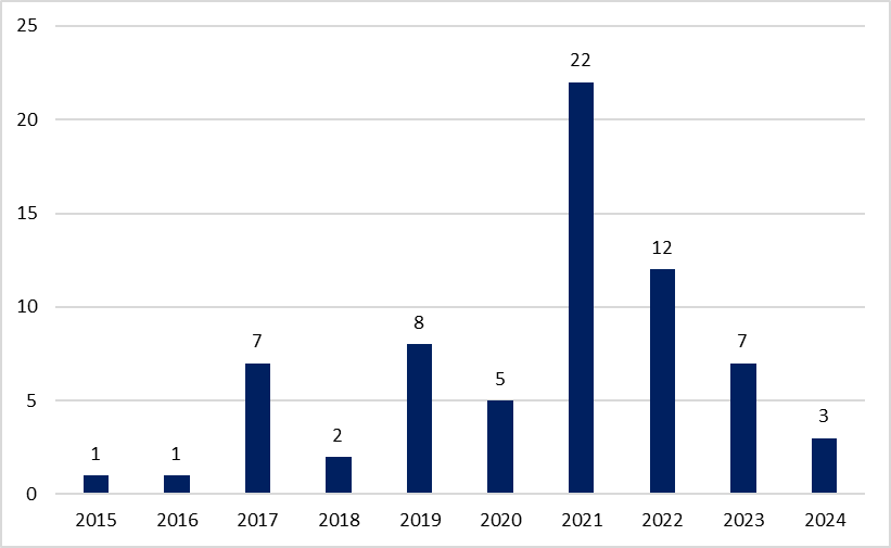 In 2024, according to Scopus, there were 9,253 joint European–Russian publications, indicating that cooperation has continued quite actively. To ensure that we are not dealing solely with large projects in which authors may not even know each another, but rather with direct and deliberate collaboration, we grouped these publications by the number of co-authors. The results are shown in Figure 2.