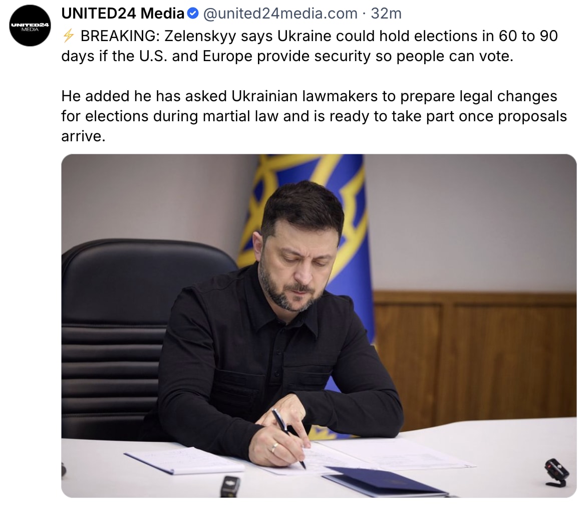 “This is a question for the people of Ukraine, not the people of other states, with all due respect to our partners. I’ll be honest: I am ready for elections… I’ve heard such hints that we are clinging to power, or that I personally am clinging to the office of President, and that’s why I’m holding onto it, and that’s why the war isn’t ending. To be honest, that is a completely unreasonable narrative.”