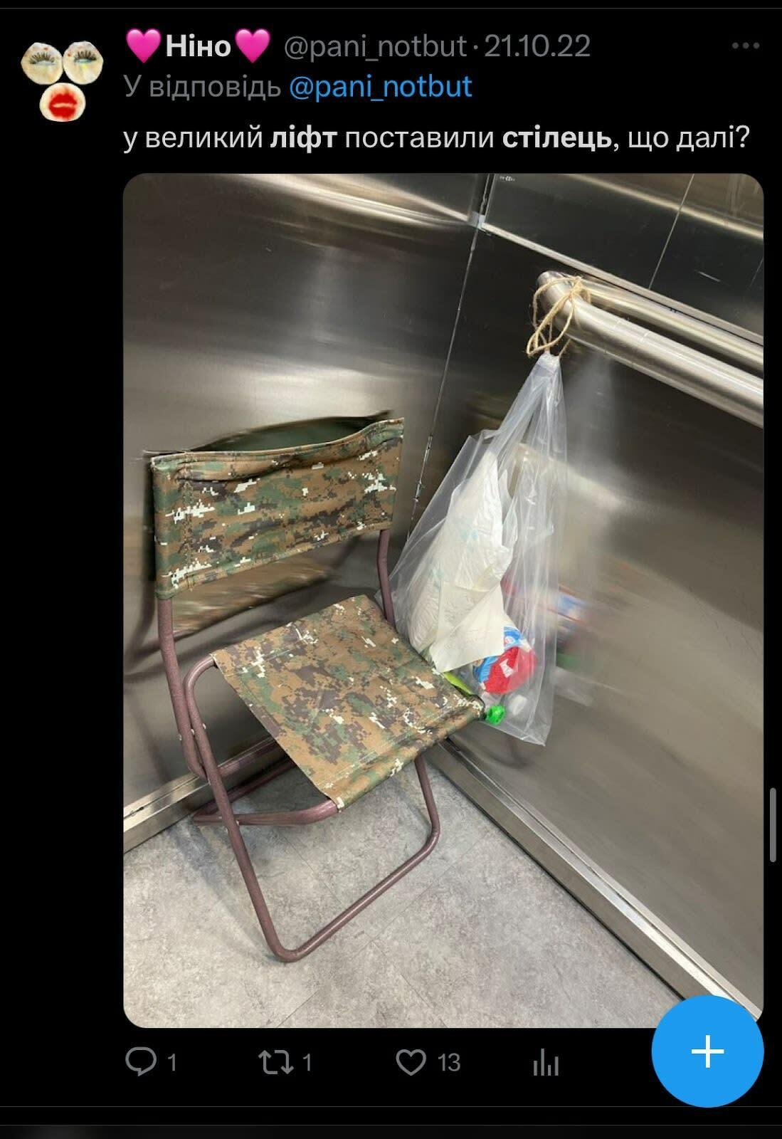 With many of his colleagues being mobilized to the military, the workload is increasing even more. For example, in Pryluky, a city of about 50,000 people, all 50 elevators were shut down for a week because the only elevator technician was mobilized into the Armed Forces of Ukraine. As of now, elevator service in Pryluky has resumed after a new technician was hired.