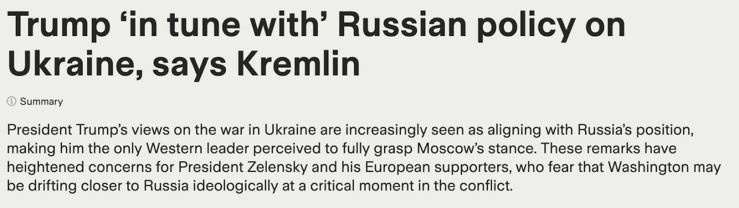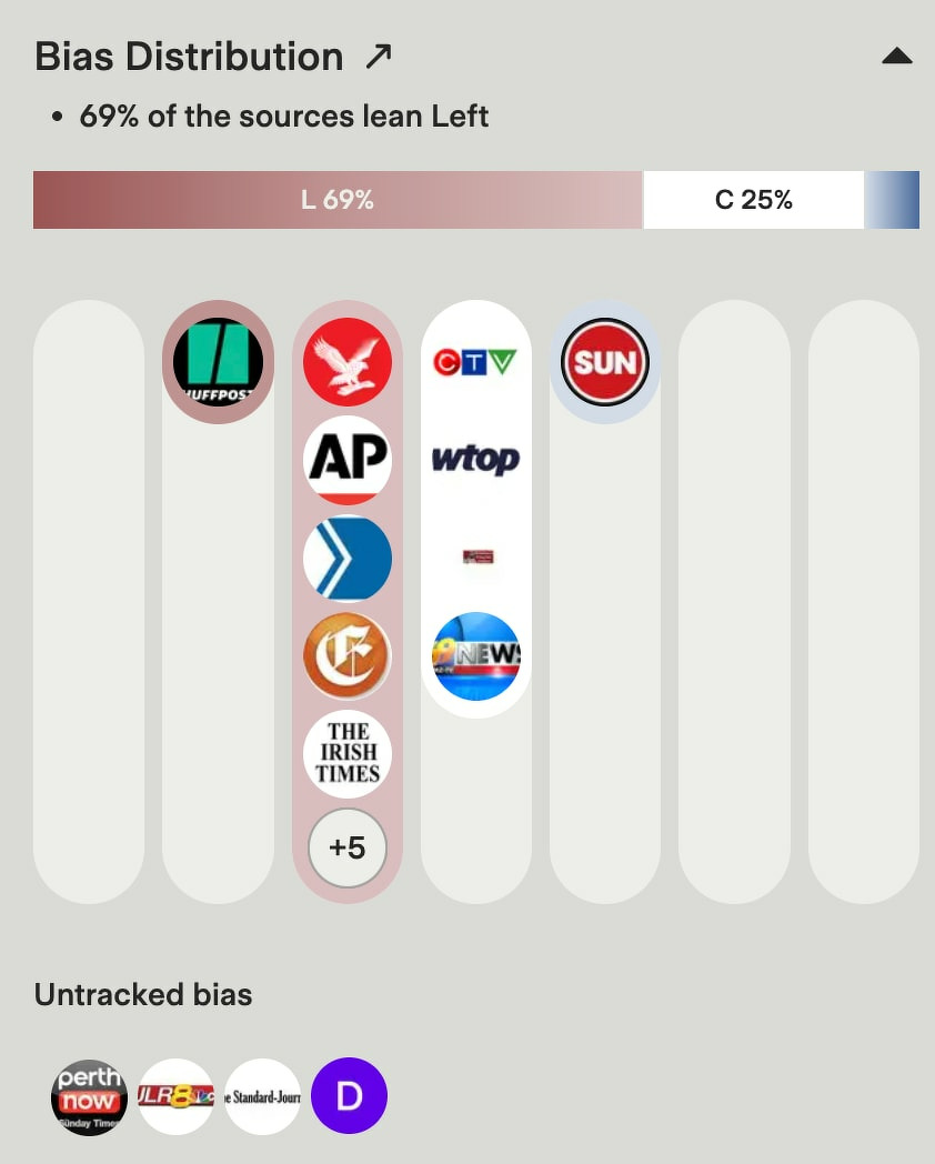 I don’t pay heed to Kremlin comments typically, but spotted this story showing Putin’s spokesperson praising Trump for being aligned with the Russian view. 27 outlets covered it, with broad coverage from the political center.