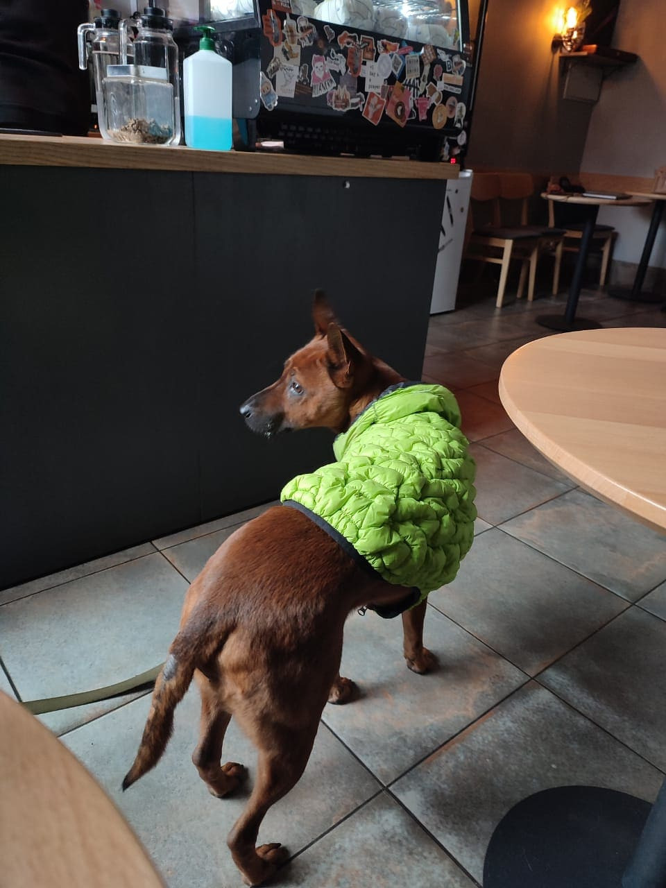 Nastia saw this stylish pup in a cafe while working. He was so friendly and approached every customer. He asked Nastia for pets several times.