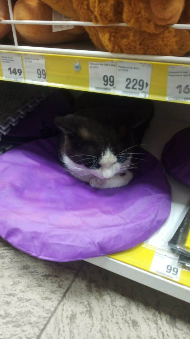 Sasha saw this cat “on sale” at a convenience store. Sometimes he comes there on cold days and lifts everyone’s spirits!