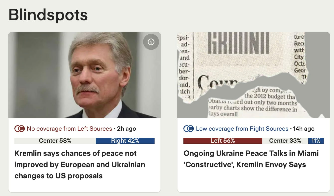 It’s bias detection helped surface the differences between how right-leaning and left-leaning outlets are covering the ongoing peace process through its ‘blindspots’ feature: