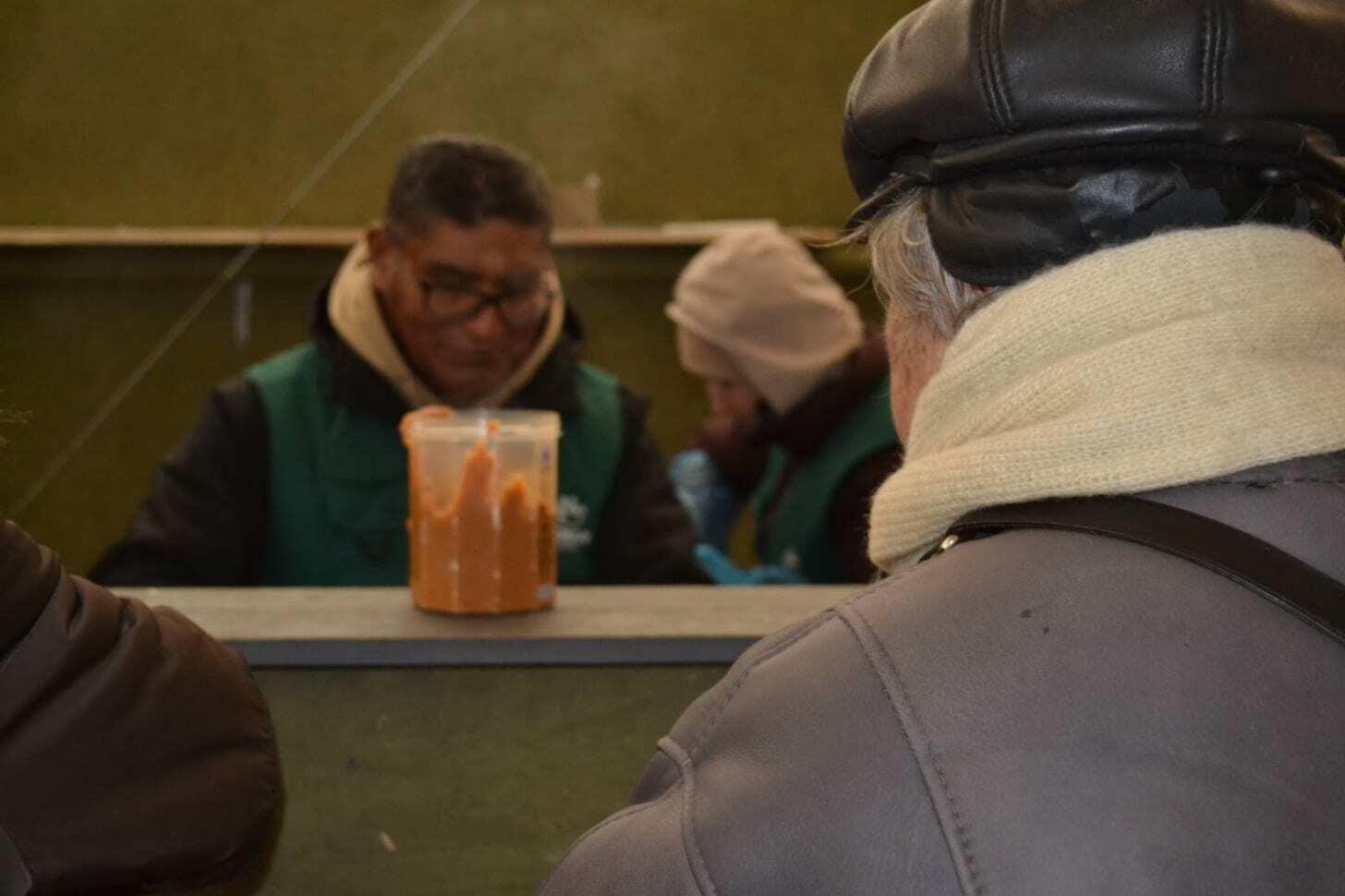 A quick gait, charismatic demeanor, and questions for the volunteers set him apart from the others. While still in line, he chats cheerfully with the elderly women who also came here for lunch.