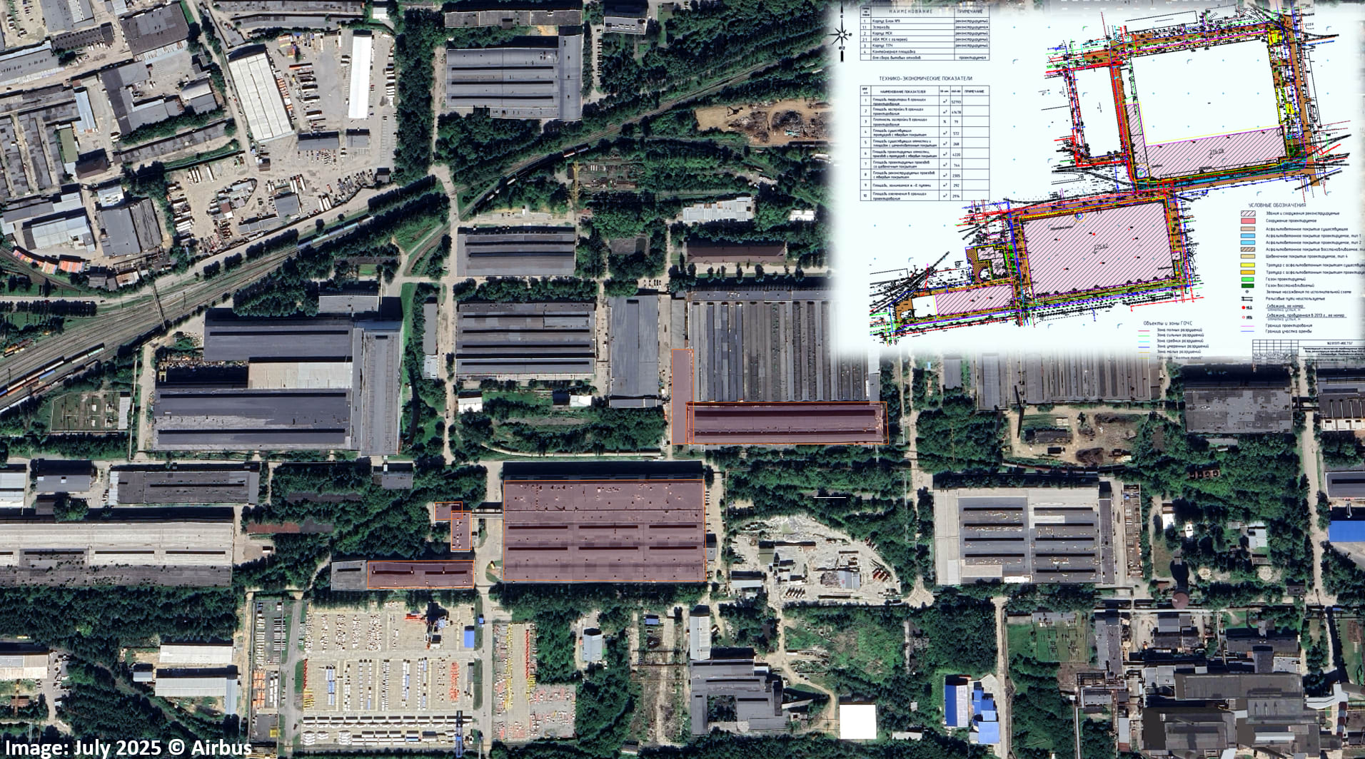 Plant No. 9 is located within the Uralmash industrial zone, a major center of heavy industry that has historically included both civilian and military production facilities in Yekaterinburg, Russia. By comparing satellite imagery with technical schematics from 2025, we identified the facilities designated for reconstruction and technical re-equipment and marked them in dark red on the map.