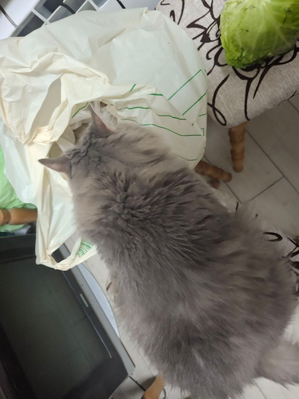 Oksana’s Mary likes to inspect grocery bags. She looks like a fluffy TSA officer.