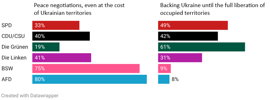 Figure 2. Percentage of German party voters who support territorial concessions by Ukraine to achieve a peace agreement and those who support continued military aid to Ukraine until the full liberation of occupied territories, July 2025