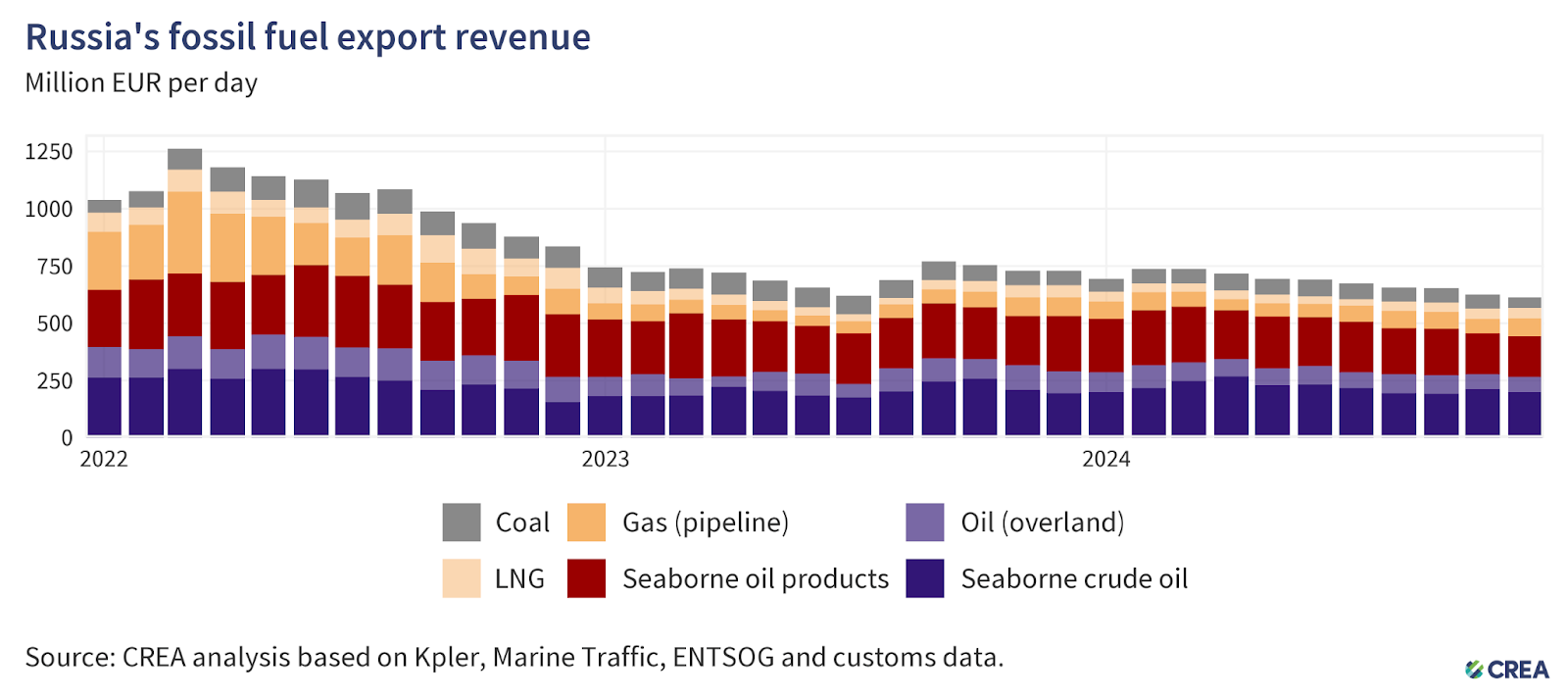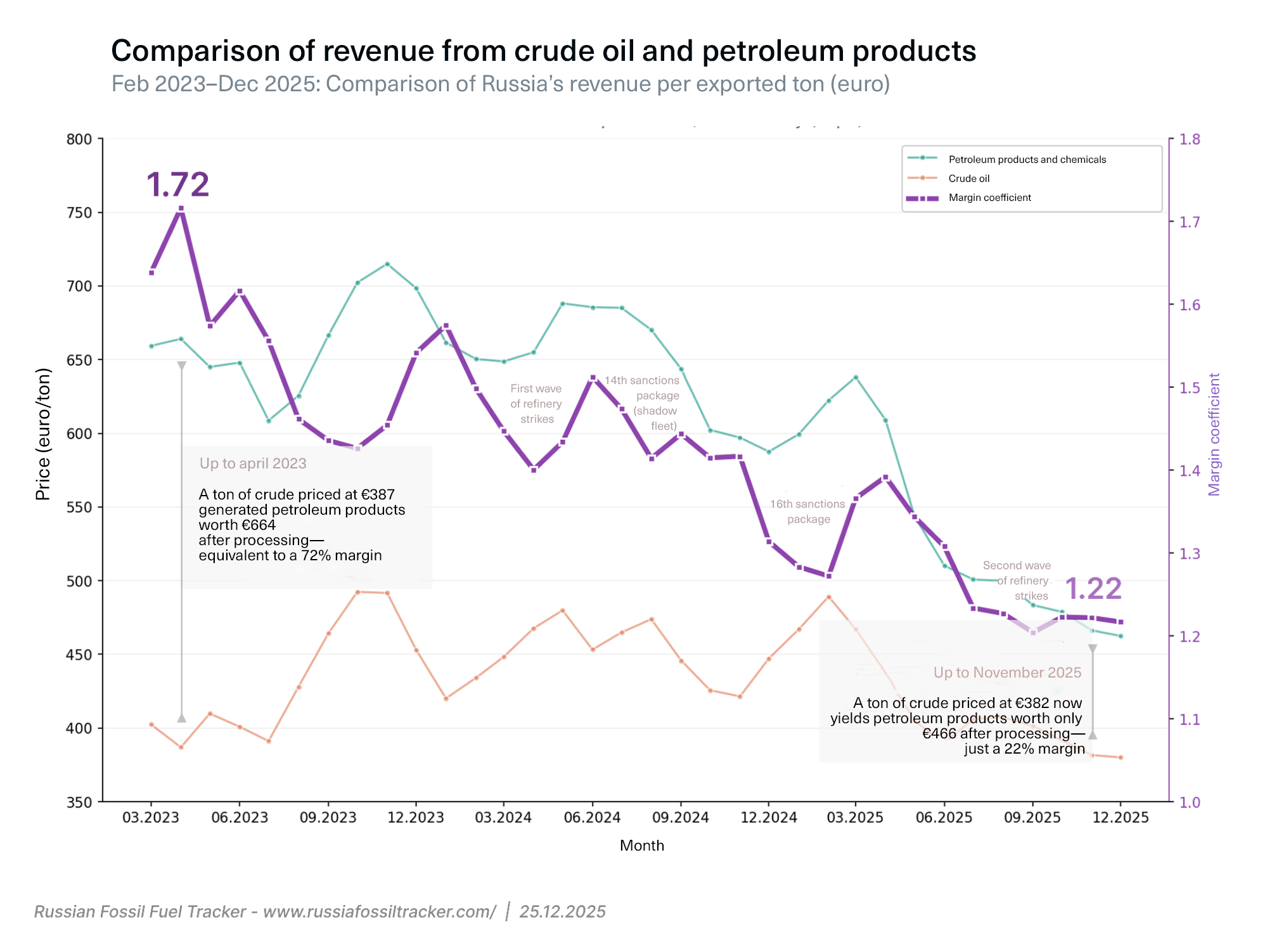 By November 2025, that coefficient had collapsed to 1.22. Now a ton of crude worth €382 yields petroleum products worth only €466—just a 22% margin. Profitability has fallen threefold in under two years.